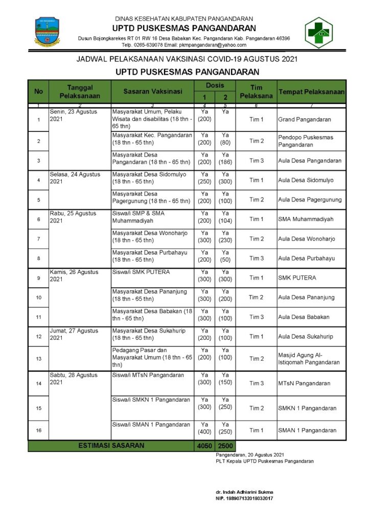Kami sampaikan informasi pelaksanaan Vaksinasi Covid-19 periode Bulan Agustus 2021 yang dilaksanakan oleh UPTD Puskesmas Pangandaran berikut ini: