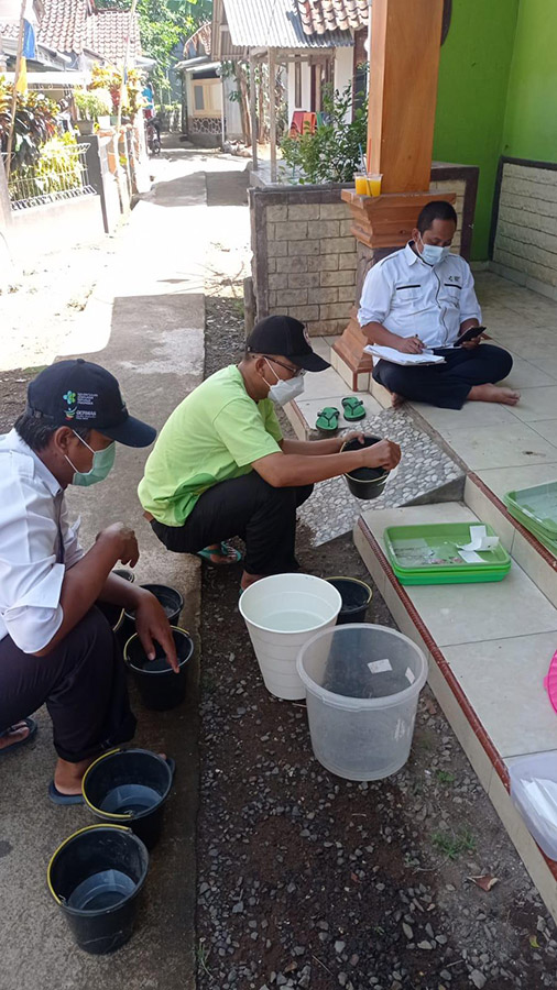 Tim Peneliti dan Litkayasa Loka Litbang Kesehatan Pangandaran yang terdiri dari Andri Ruliansyah, SKM., M.Sc. (Ketiga dari kiri), Wawan Ridwan, SKM., Asep Jajang Kusnandar dan Ajat Sudrajat sedang mengambil ovitrap di wilayah Desa Babakan Kabupaten Pangandaran, 9 September 2021. Kegiatan penangkapan nyamuk dengan ovitrap dilaksanakan secara berkala untuk mengurangi dan mengendalikan populasi nyamuk. Ovitrap merupakan suatu alat khusus buatan yang dirancang untuk mengembangbiakan nyamuk. Ovitrap biasanya berupa wadah sejenis ember berwarna hitam berisi sedikit air yang dilapisi kertas saring di bagian dalamnya. Ovitrap dapat dibuat sendiri di rumah sebagai cara alternatif untuk memutus siklus hidup nyamuk alami tanpa bahan kimia. [DAC]