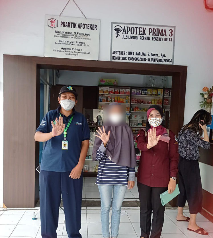 Peneliti, Wawan Ridwan, SKM. (Kiri), berfoto bersama responden dalam wawancara penanganan obat Tuberkulosis di Apotek Prima Kota Tasikmalaya.