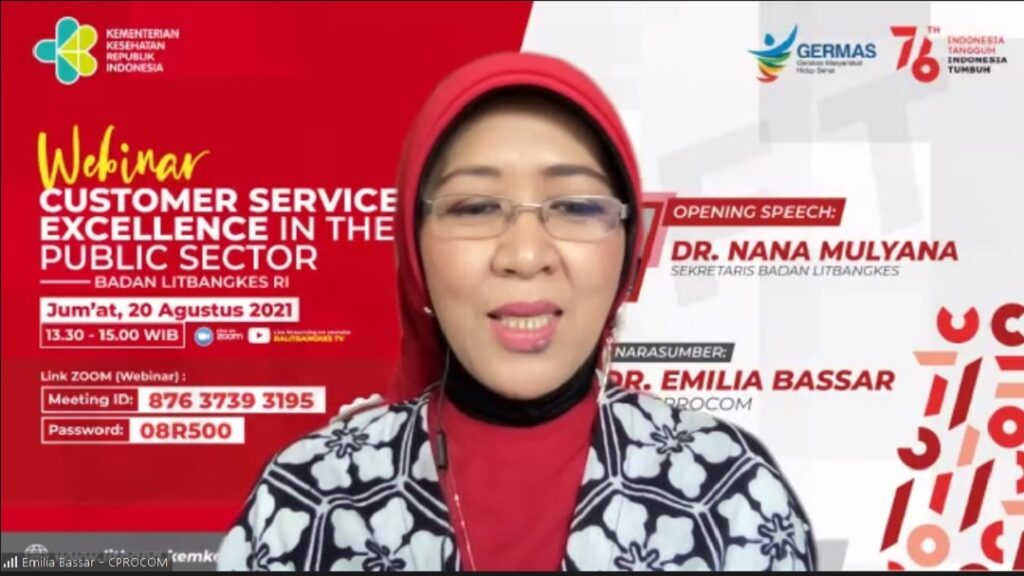 Badan Litbangkes menyelenggarakan Webinar “Customer Service Excellence in the Public Sector“, Jumat 20 Agustus 2021 secara daring. Kegiatan yang diikuti oleh 266 peserta ini menampilkan narasumber CEO CPROCOM sekaligus Praktisi Kehumasan, Dr. Emilia Bassar. Kegiatan Webinar “Customer Service Excellence in the Public Sector” dilaksananakan dalam rangka meningkatkan pelayanan publik sebagai wujud Reformasi Birokrasi.